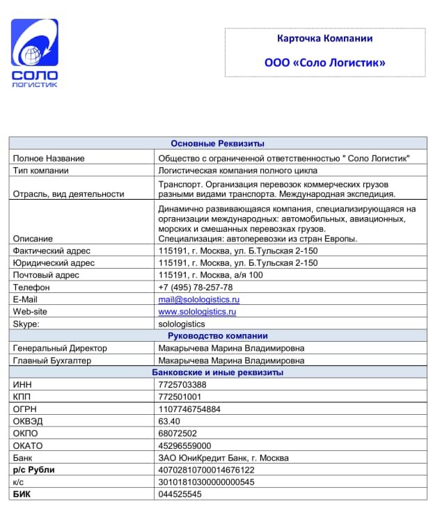 Внимание! Компания ООО "Соло Логистик" зарегистрирована в г. Москве, не имеет ФИЛИАЛОВ и ПАРТНЕРСКИХ КОМПАНИЙ ни в Санкт-Петербурге, ни в Красноярске, ни в одном другом городе России. Любая фирма со схожим названием является НЕ СВЯЗАННЫМ С НАМИ ЮРИДИЧЕСКИМ ЛИЦОМ. Любые договора, заключенные с нашими реквизитами и от имени нашей компании "агентами" или "партнерами" в любом городе России, являются МОШЕННИЧЕСТВОМ. Полная информация о схемах мошенничества и статья "6 ШАГОВ чтобы избежать мошенничества при приеме на работу" находятся здесь. Если Вы стали жертвой такого недобросовестного поведения, свяжитесь с нами по телефону +7 (495) 78-257-78, мы свяжемся с правоохранительными органами.